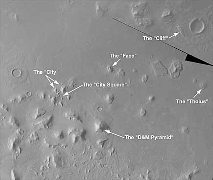 "Марсианский сфинкс" отнюдь не является центром области, получившей название Сидония (Cydonia). Он расположен примерно на 15 км. севернее математического центра Сидонии и наклонен приблизительно на 300 по отношению к марсианскому меридиану. (Фото 7)