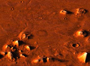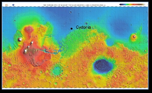 Фото 9.Расположение области Сидония (40,8* С.Ш., 9,6* З.Д) Руководитель программы "Викинг" К. Снайдер, тот самый, что допустил утечку ценной фотографии, не скрывая раздражения, заявил, что "обнаруженное изображение - всего лишь скальные образования, принявшие причудливые очертания в результате игры света и теней". Советский академик Сагдеев горячо поддержал эту мысль, сказав, что нового самообмана, такого, что имел место с каналами, уже не будет. Не воздержались от изучения фотографии и в Институте геохимии и аналитической химии им. Вернадского. По мнению кандидата географических наук Р. Кузьмина, "все дело в косом освещении, свет низкорасположенного Солнца отбрасывает тени от обычных бугорков, а что касается ноздрей и ожерелья на лице, то это обычные помехи, возникшие при передаче изображения на Землю!". Действительно, по законам теории вероятностей коварная игра света и тени вполне может вдруг составить любое изображение, одно на целой планете, вплоть до надписи "Привет, земляне". Но если это не настоящее изображение, то стоит только поменять направление освещения, как весь эффект немедленно пропадет. И работники НАСА перерыли тысячи фотографий и нашли-таки еще один, ранее забракованный, снимок (70A13), сделанный на другом витке и, следовательно, в другое время. Сфинкс хотя и был едва виден, но тем не менее не исчез! Получив в свои руки два снимка, американские специалисты приступили к компьютерной постройке стереоизображения. Ноздри, ожерелье, другие точки, считавшиеся помехами, на новом изображении почему-то не исчезли, зато ЭВМ уверенно вырисовала только ею одной увиденные зрачки глаз и даже зубы в приоткрытом рту! В те времена соперничать с Америкой в области компьютерной графики нам было еще очень трудно, однако решение, найденное самарским ученым Владимиром ТЮРИНЫМ - АВИНСКИМ, понравилось по своей простоте и наглядности даже за океаном. Благодаря работе с пластилиновой копией сфинкса, он добился именно такой его формы, при которой при любом освещении не пропадал эффект сходства с человеческим лицом. Теперь стало возможным оценить примерные размеры исполина. Длина от подбородка до волос - 1,5 км, ширина - 1,3 км, высота от поверхности пустыни до кончика носа - 0,5 км!