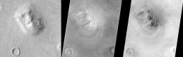 Фото 14. Самая свежая фотография "сфинкса" 08.04.2001 Из-за большого ажиотажа, разгоревшегося вокруг "Лица" было решено провести повторное фотографирование области Сидония. 8 апреля 2001 года "Марс Глобал Сервейер" в 20:54 (UTC), пролетел так, что бы он мог захватить "Лицо", находящееся на расстоянии 165 км в стороне и на дистанции 450 км. Полученное фото имеет разрешение 2 метра на точку. (Если бы на Марсе присутствовали объекты размером с обычный пассажирский реактивный самолет, то они были бы различимы в таком масштабе). Новая фотография "Лица" охватывает область протяженностью 3,6 км. Солнце освещает его с левой нижней части. |