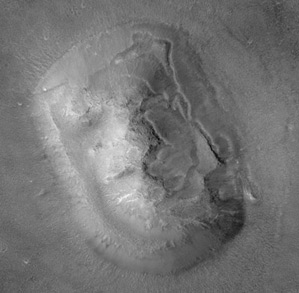 Фото 10. Ещё одно изображение структуры, напоминающей скульптурное изображение человеческого лица, только сфотографированно оно было в другом районе Марса - в Утопии. Как вы понимаете, на Земле ничего подобного встретить просто невозможно. Нет,- вновь заявили скептики,- такой гигант может построить только очень могущественная цивилизация, но ее на Марсе нет, а если бы и была, то зачем ей статуя, которую можно рассмотреть только из Космоса? И сфинкс вновь перешел в разряд случайного совпадения, только теперь не света и тени, а как результат выветривания горных пород. С известной долей натяжки можно было бы согласиться с подобным утверждением, если бы это был... единичный случай.